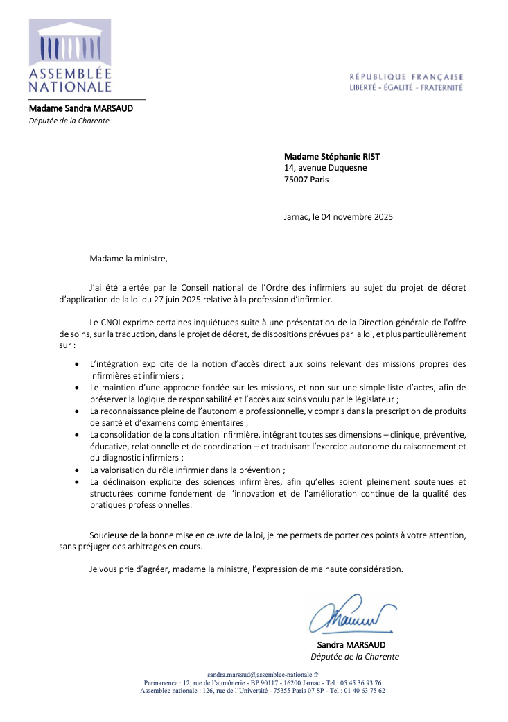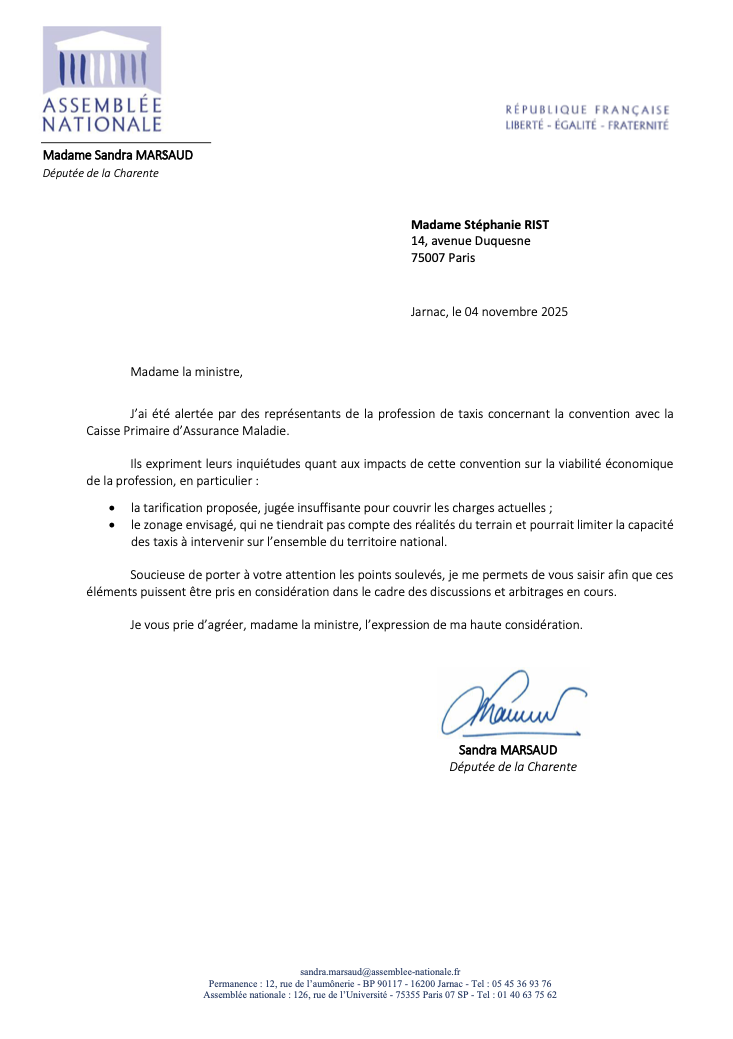 J'ai adressé à Stéphanie RIST, Ministre de la Santé, des Familles, de l’Autonomie et des Personnes handicapées deux courriers, qui visent à l'alerter sur le projet de décret d'application relatif à la profession d'infirmier, et un second relatif à la convention reliant la profession de taxis et la Caisse Primaire d'Assurance Maladie.