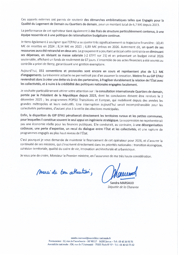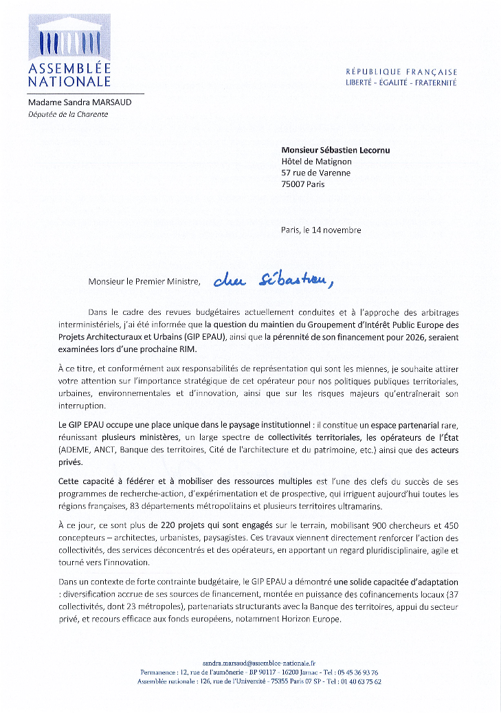 Enfin, dans le cadre du projet de loi de finances pour 2026, j'ai alerté le Premier ministre sur l'importance stratégique du Groupement d'Intérêt Public Europe des Projets Architecturaux et Urbains, qui est un espace partenarial interministériel rare, réunissant un large spectre de collectivités territoriales.